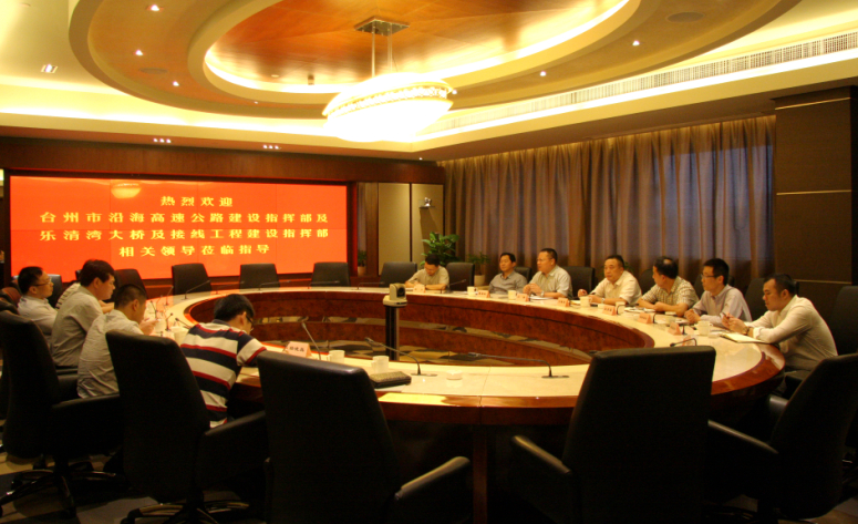 圖為臺州市沿海高速公路建設(shè)指揮部及樂清灣大橋及接線工程指揮部領(lǐng)導(dǎo)與物產(chǎn)金屬領(lǐng)導(dǎo)交流洽談