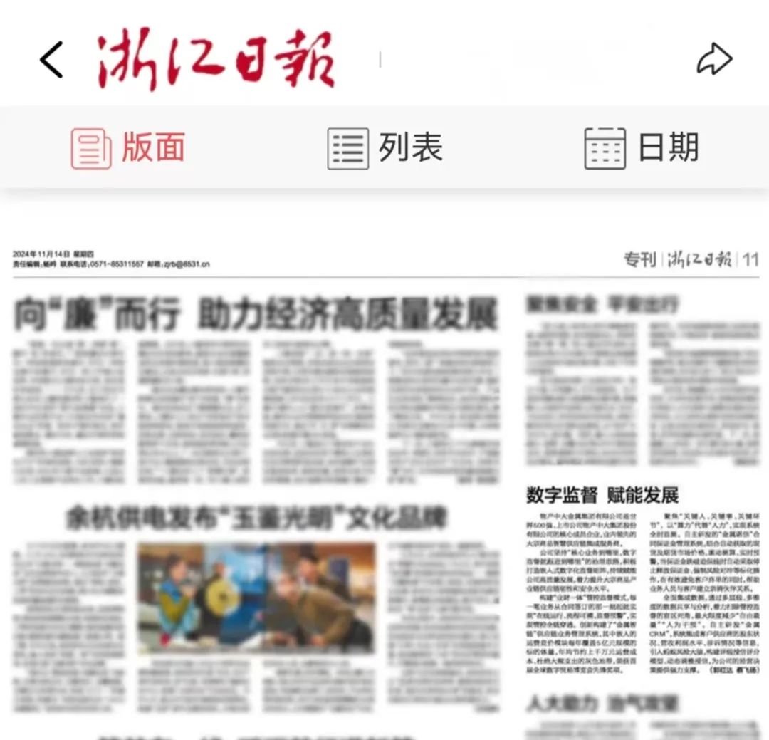 11月14日,《浙江日報》刊發物產中大金屬公司“嵌入式”數字化監督經驗做法與成效。近年來,公司聚焦發展“穩進立”,以數智賦能、強嵌入監督、嚴管控提效,積極探索打造“嵌入式”數字化監督“三全矩陣”,護航公司在安全、規范、高效、清廉的主航道上行穩致遠。
